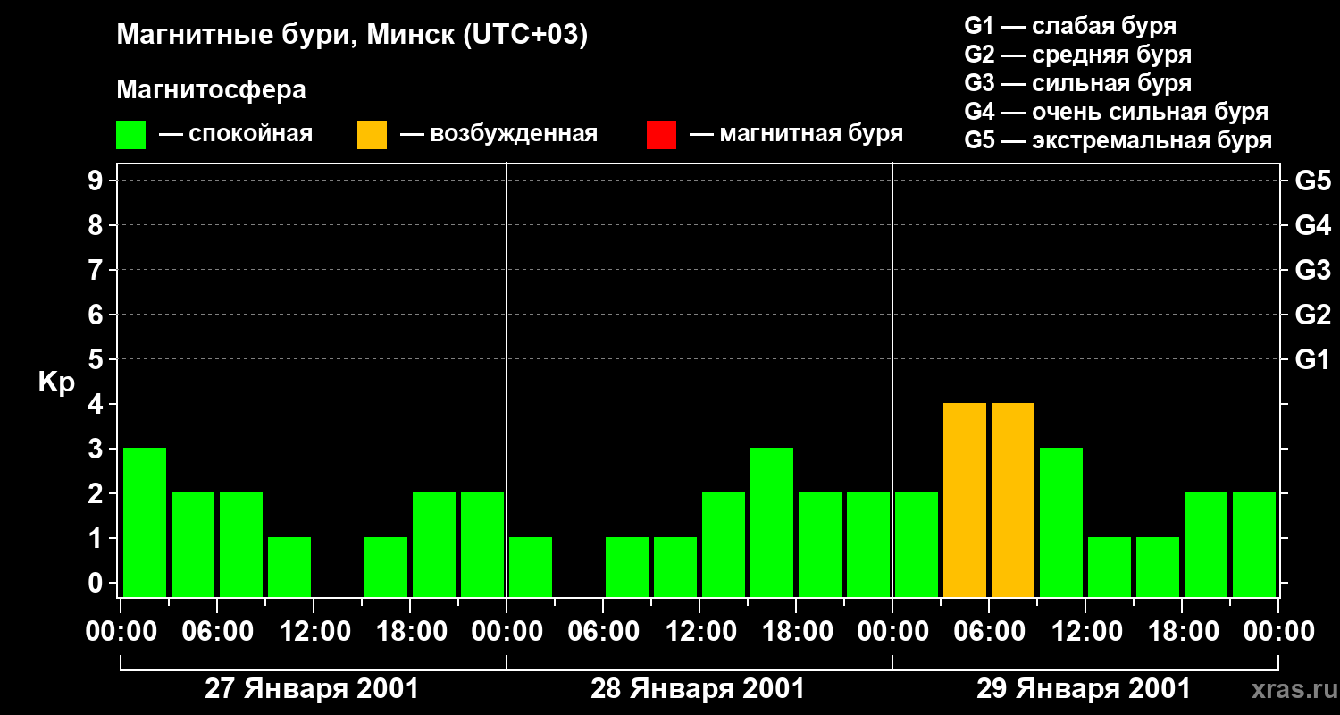Изменения геомагнитного индекса Kp с 27 по 29 января 2001 года для средних широт