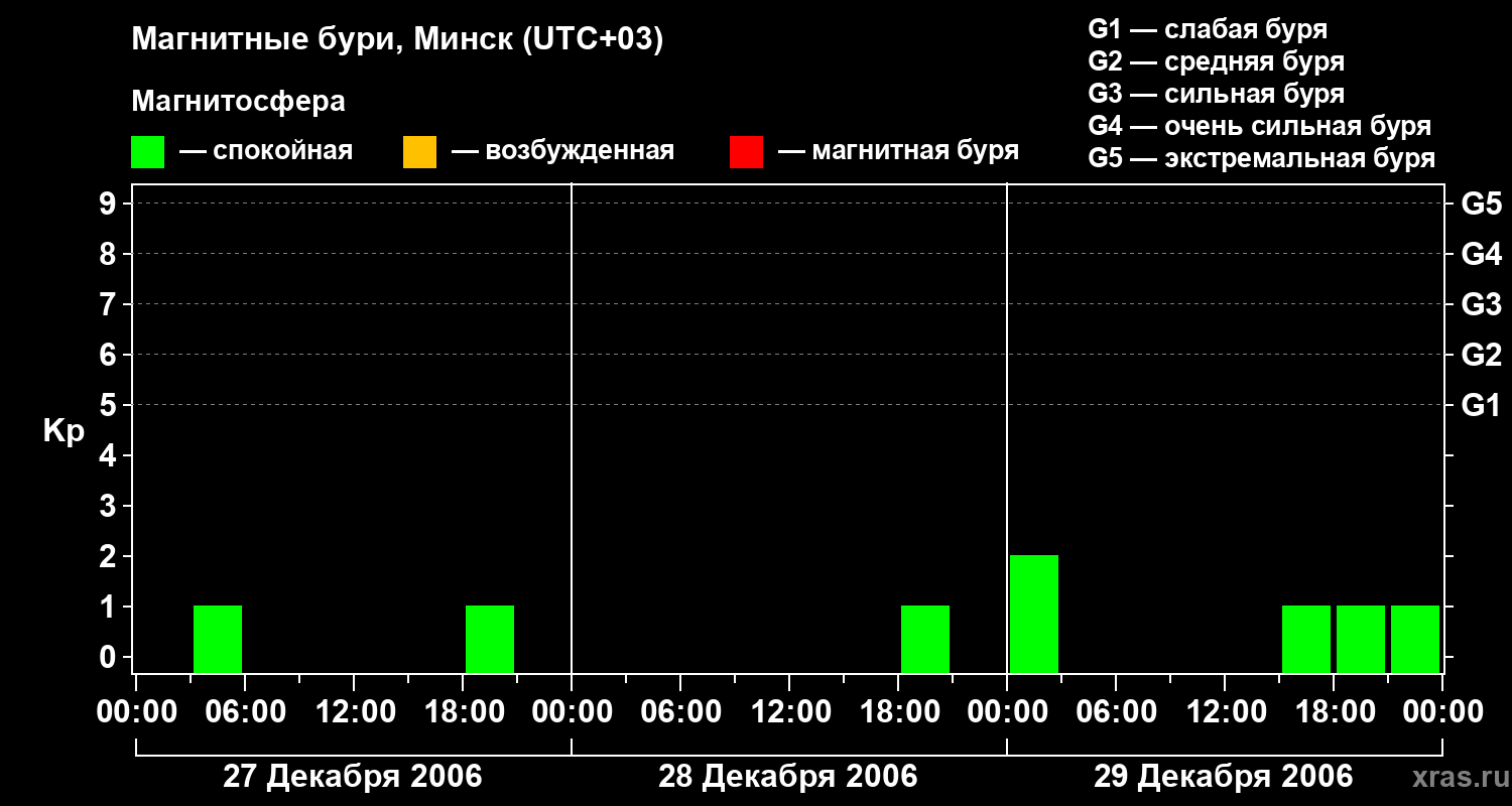 Изменения геомагнитного индекса Kp с 27 по 29 декабря 2006 года для средних широт
