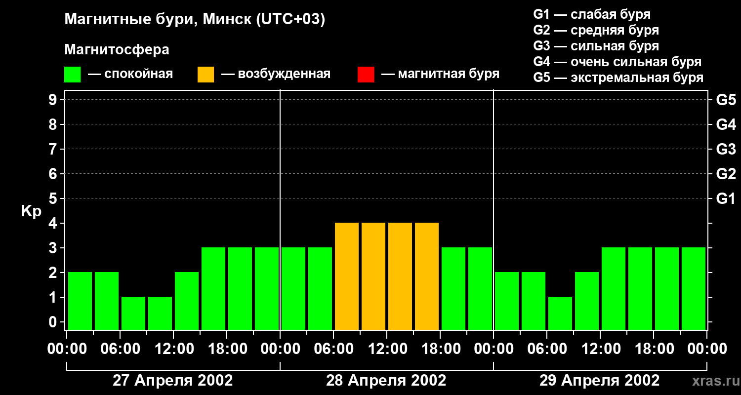 Изменения геомагнитного индекса Kp с 27 по 29 апреля 2002 года для средних широт