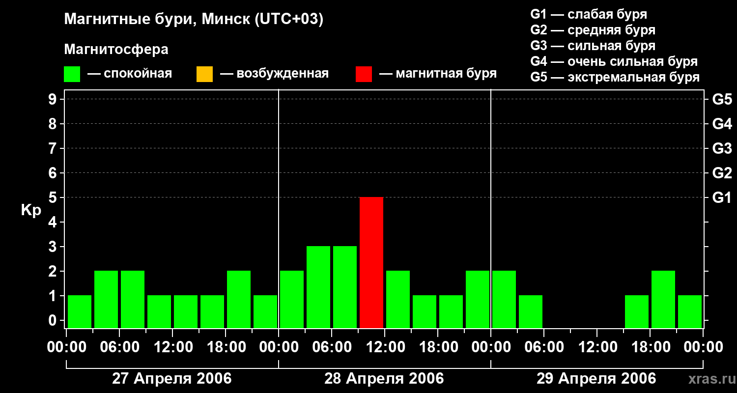 Изменения геомагнитного индекса Kp с 27 по 29 апреля 2006 года для средних широт