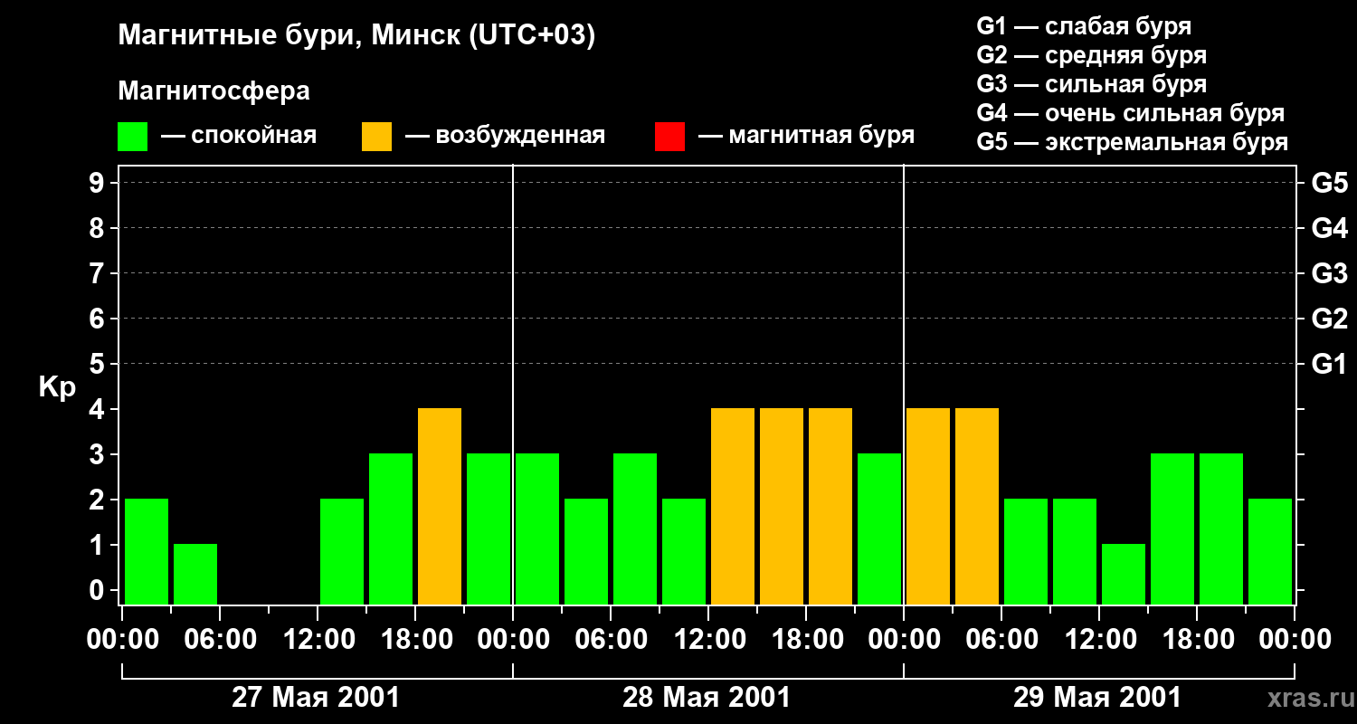 Изменения геомагнитного индекса Kp с 27 по 29 мая 2001 года для средних широт