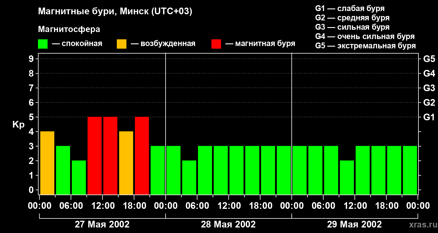 Изменения геомагнитного индекса Kp с 27 по 29 мая 2002 года для средних широт