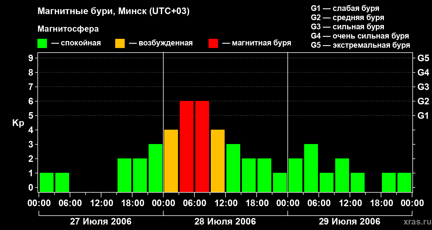 Изменения геомагнитного индекса Kp с 27 по 29 июля 2006 года для средних широт