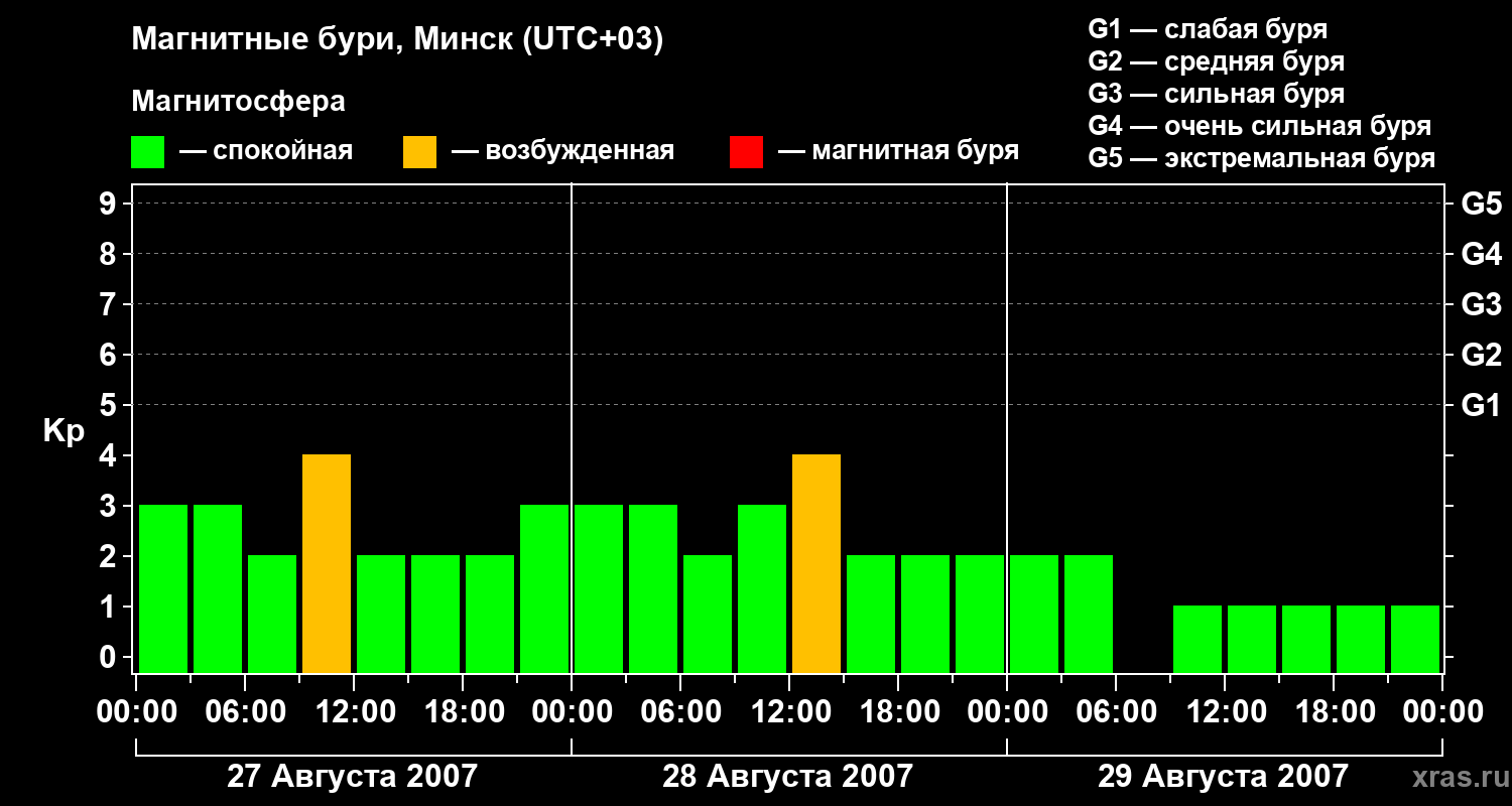 Изменения геомагнитного индекса Kp с 27 по 29 августа 2007 года для средних широт