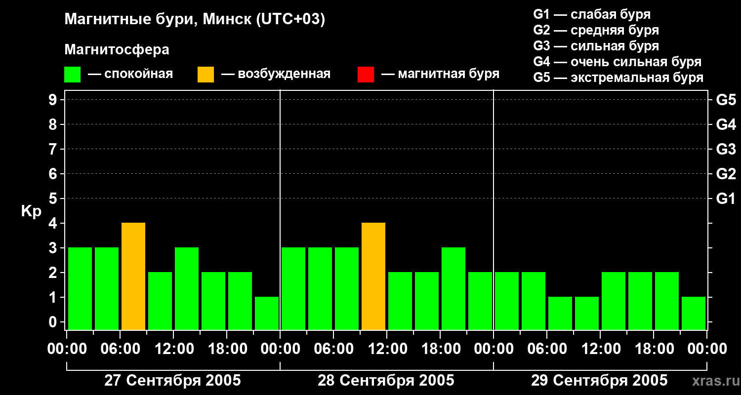 Изменения геомагнитного индекса Kp с 27 по 29 сентября 2005 года для средних широт