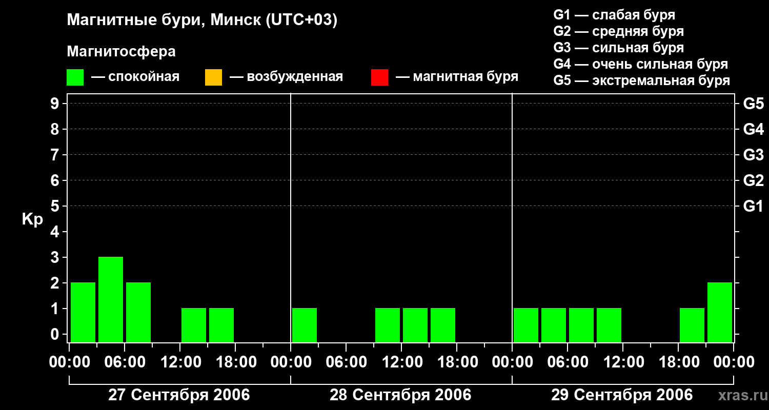Изменения геомагнитного индекса Kp с 27 по 29 сентября 2006 года для средних широт