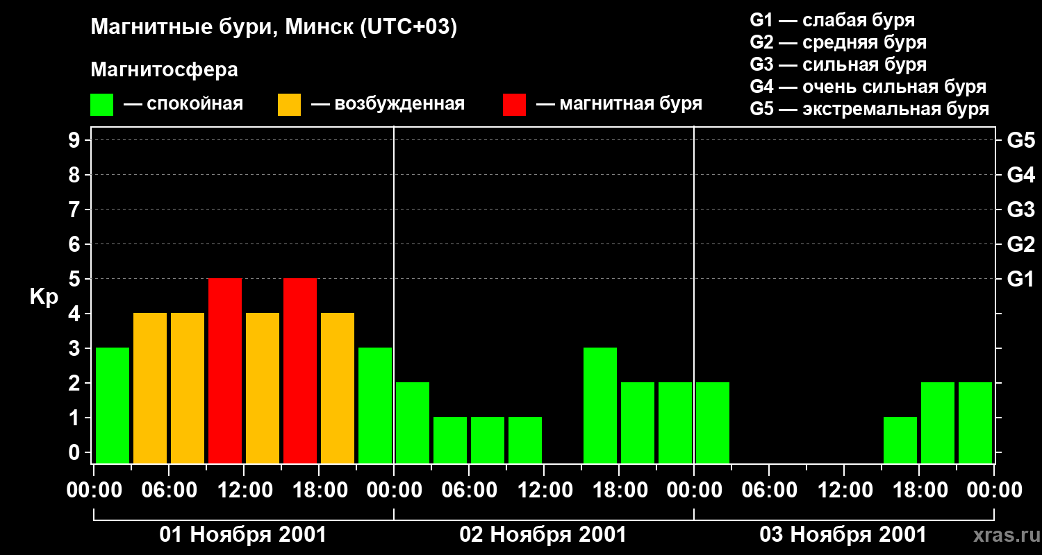Изменения геомагнитного индекса Kp с 1 по 3 ноября 2001 года для средних широт