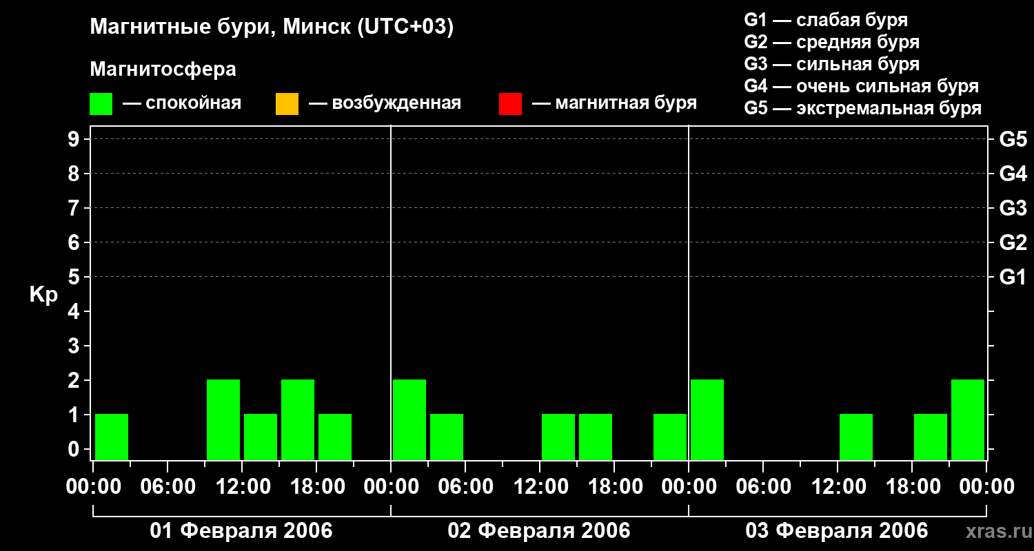 Изменения геомагнитного индекса Kp с 1 по 3 февраля 2006 года для средних широт