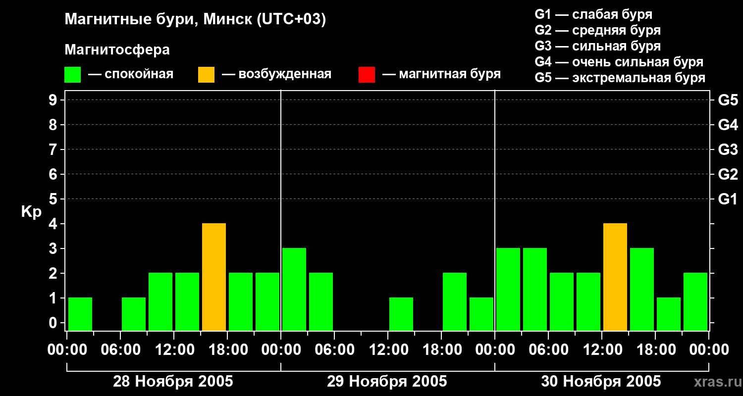 Изменения геомагнитного индекса Kp с 28 по 30 ноября 2005 года для средних широт