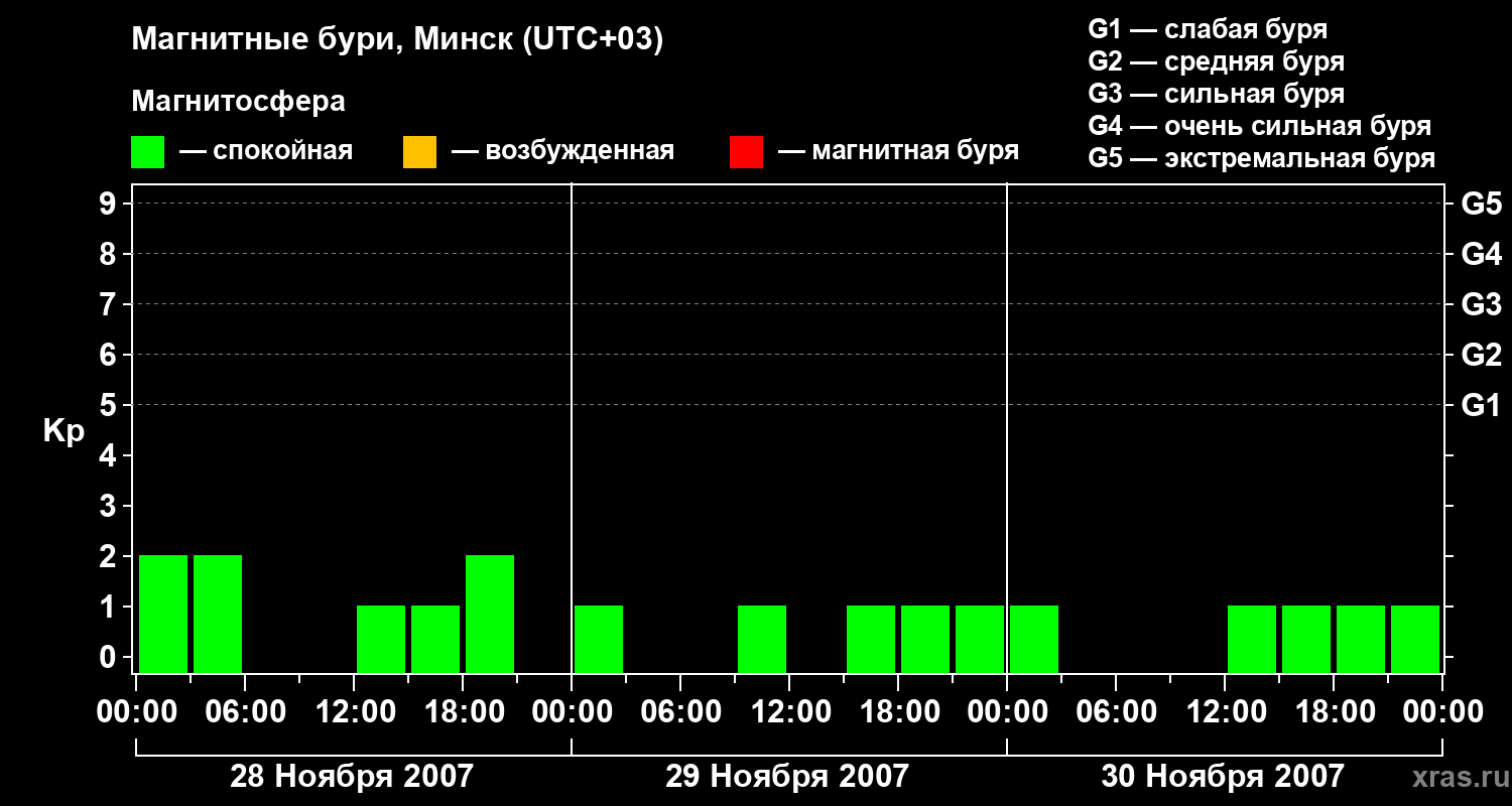 Изменения геомагнитного индекса Kp с 28 по 30 ноября 2007 года для средних широт