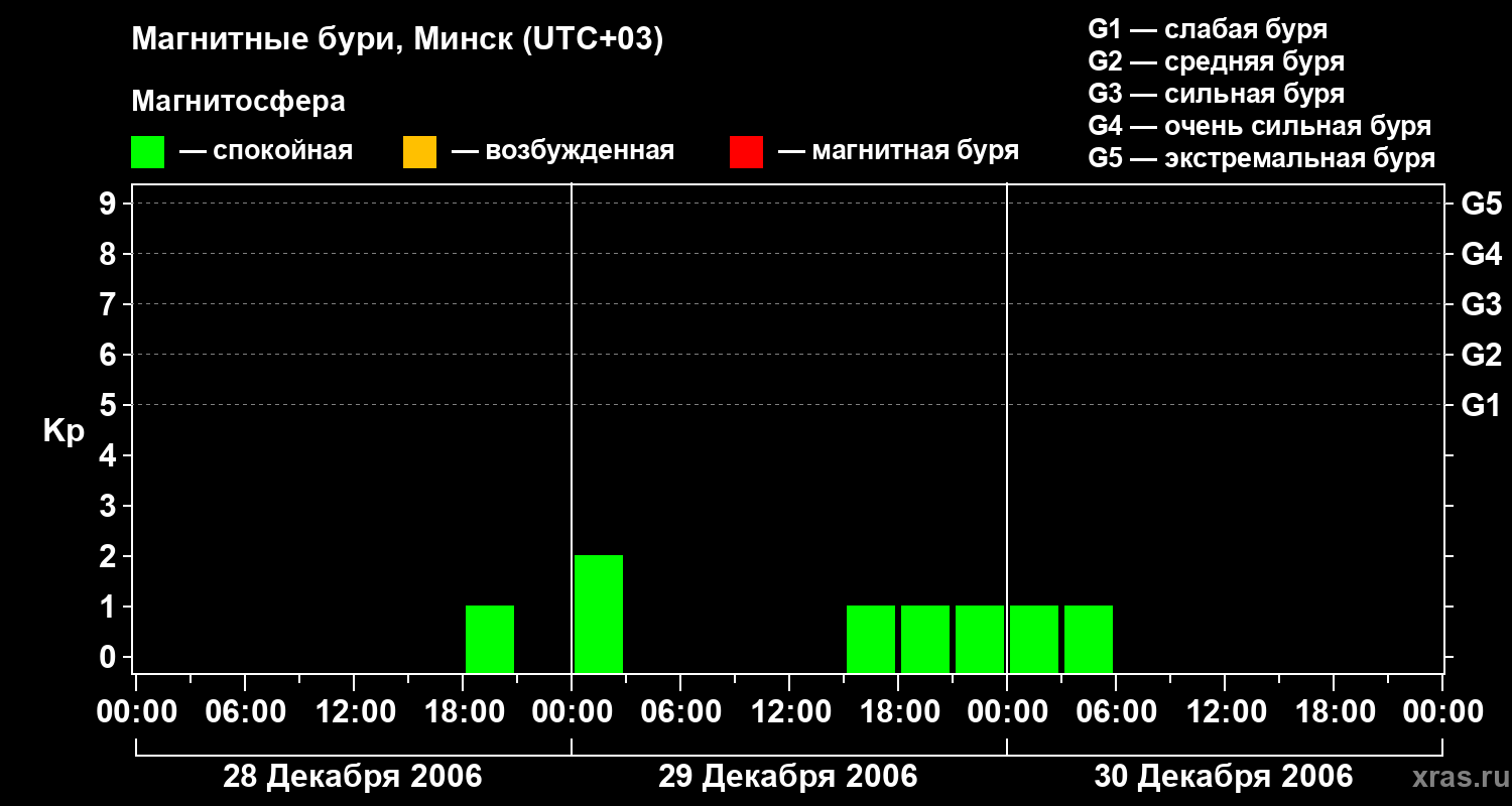 Изменения геомагнитного индекса Kp с 28 по 30 декабря 2006 года для средних широт