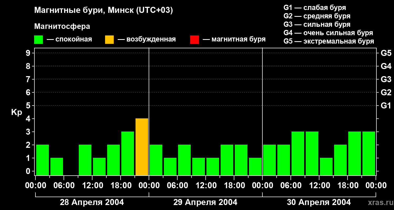 Изменения геомагнитного индекса Kp с 28 по 30 апреля 2004 года для средних широт