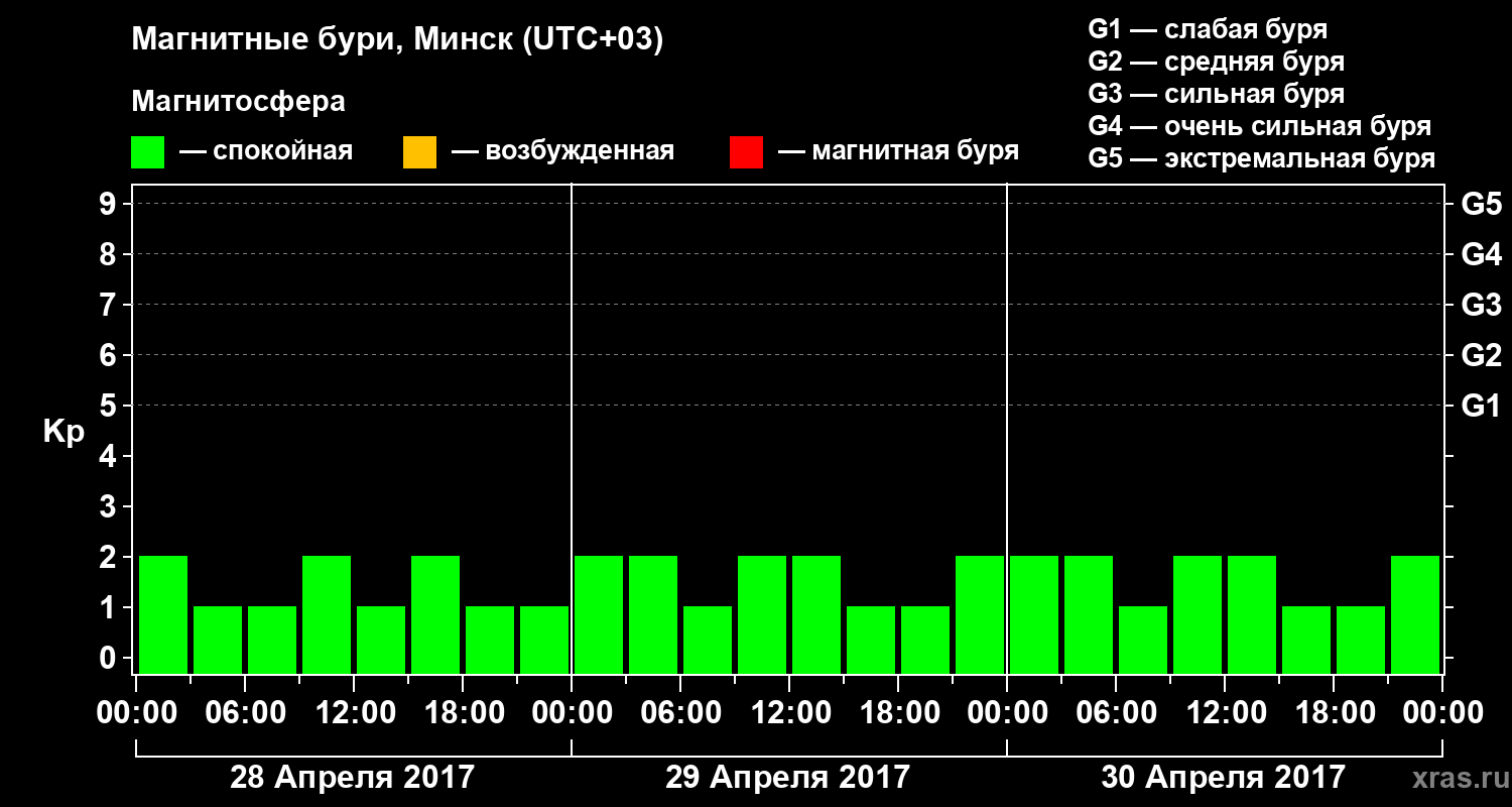 Изменения геомагнитного индекса Kp с 28 по 30 апреля 2017 года для средних широт