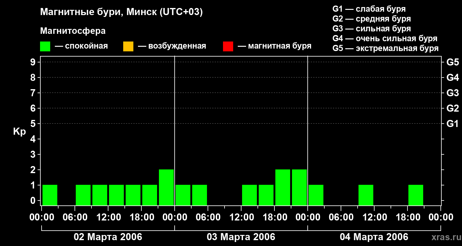 Изменения геомагнитного индекса Kp с 2 по 4 марта 2006 года для средних широт