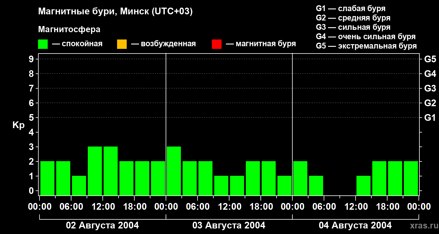 Изменения геомагнитного индекса Kp с 2 по 4 августа 2004 года для средних широт