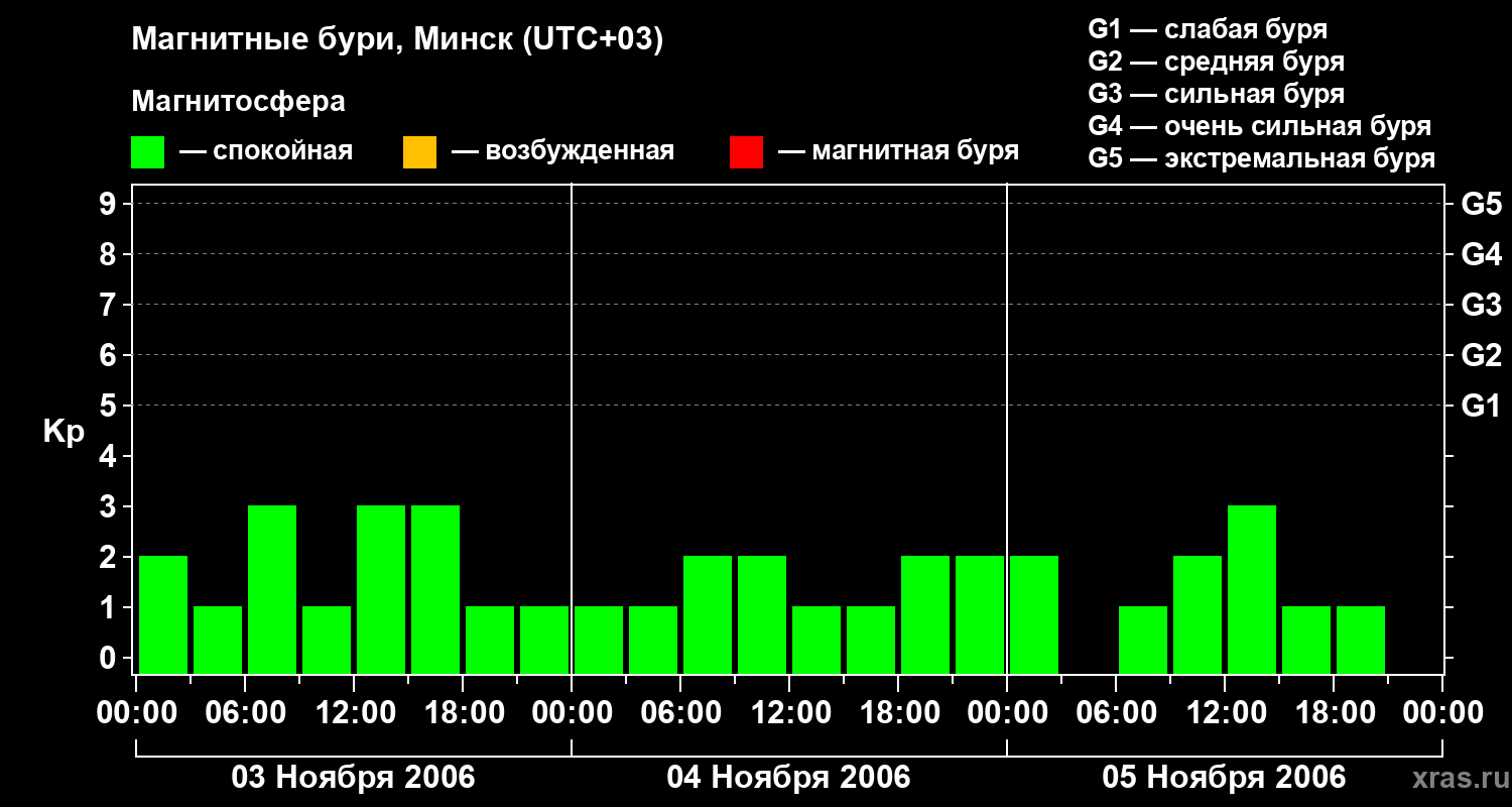Изменения геомагнитного индекса Kp с 3 по 5 ноября 2006 года для средних широт