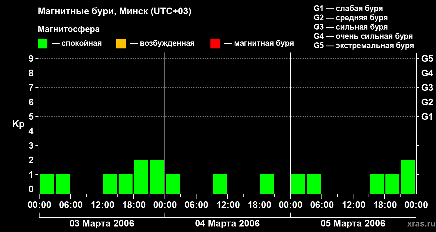 Изменения геомагнитного индекса Kp с 3 по 5 марта 2006 года для средних широт