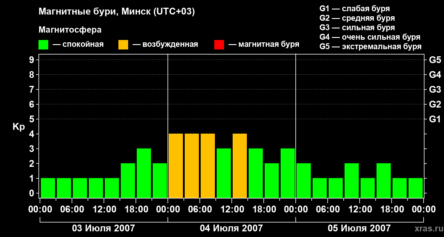 Изменения геомагнитного индекса Kp с 3 по 5 июля 2007 года для средних широт