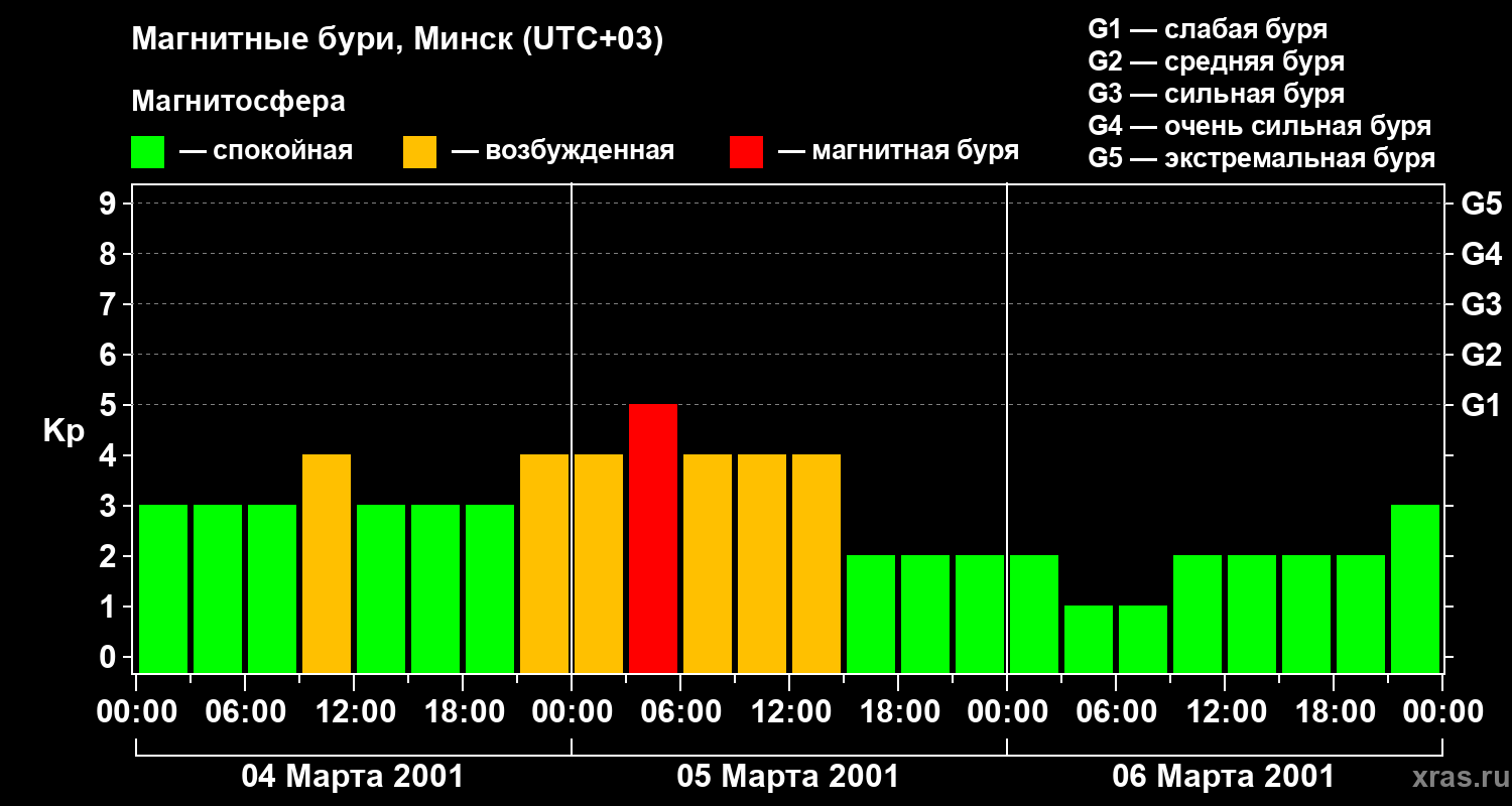 Изменения геомагнитного индекса Kp с 4 по 6 марта 2001 года для средних широт