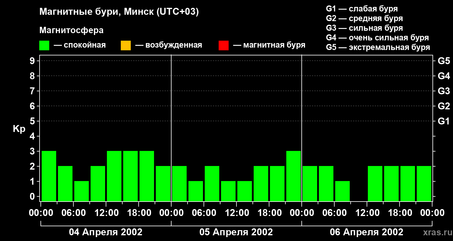 Изменения геомагнитного индекса Kp с 4 по 6 апреля 2002 года для средних широт