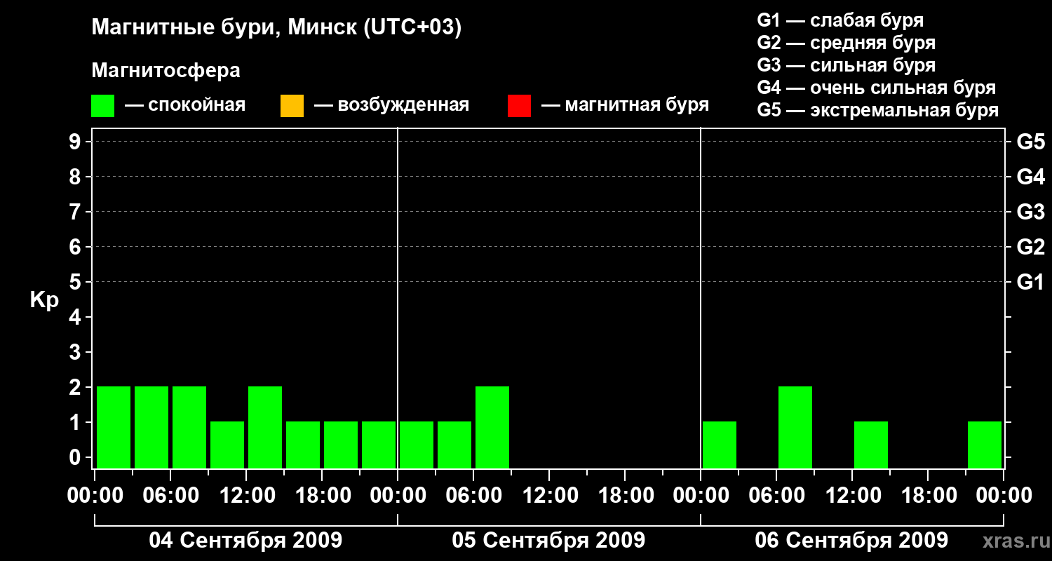 Изменения геомагнитного индекса Kp с 4 по 6 сентября 2009 года для средних широт