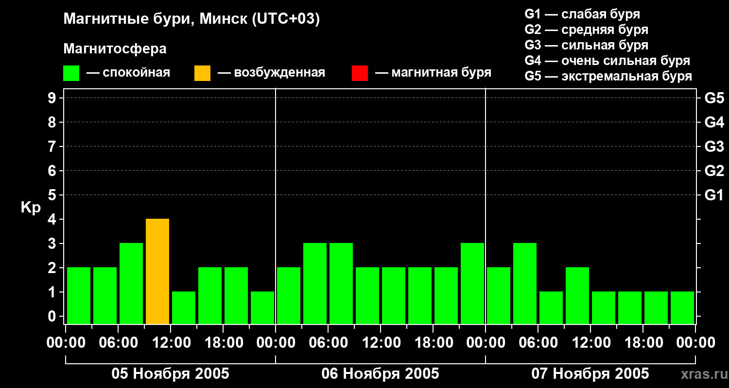 Изменения геомагнитного индекса Kp с 5 по 7 ноября 2005 года для средних широт