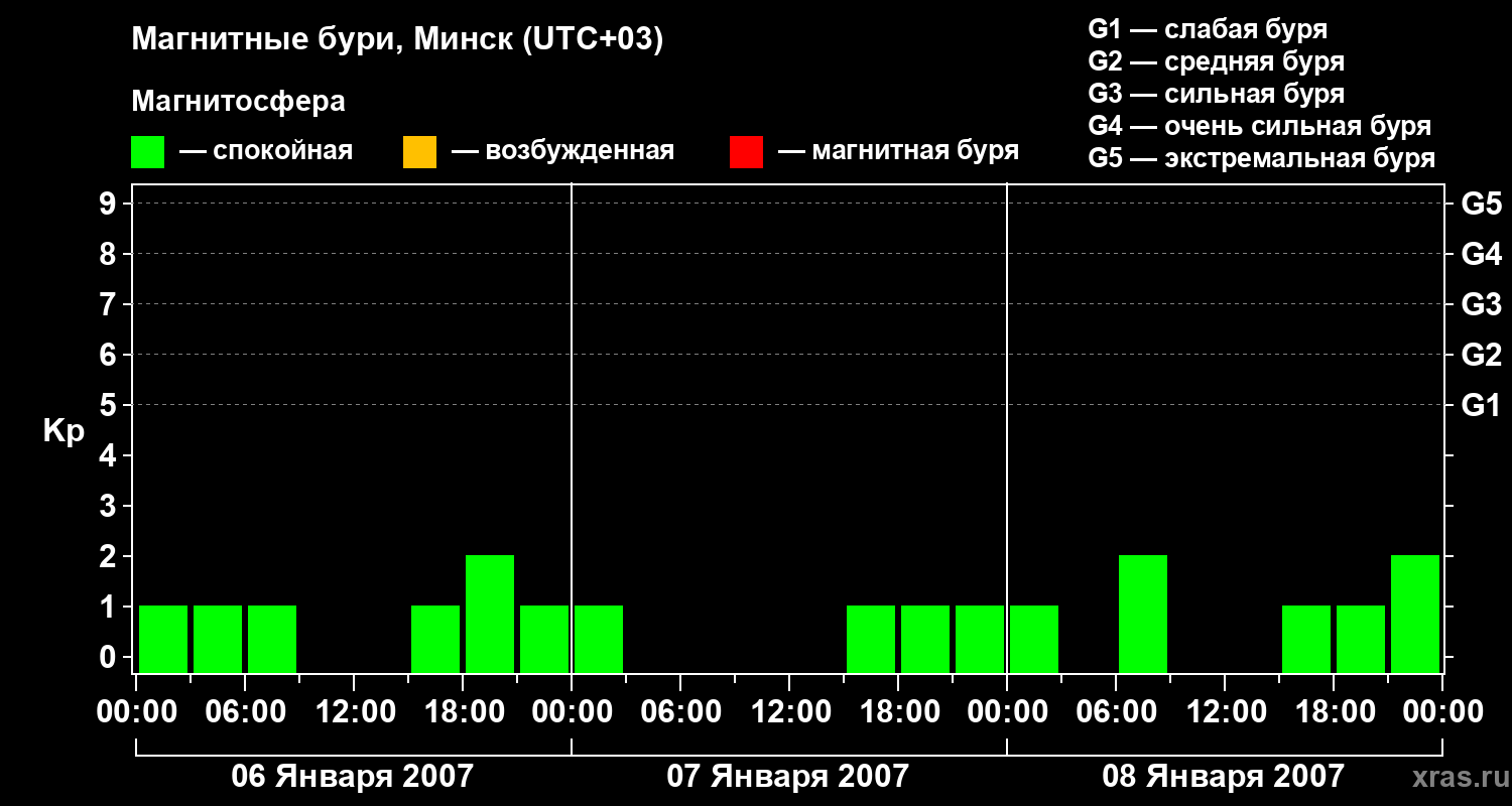 Изменения геомагнитного индекса Kp с 6 по 8 января 2007 года для средних широт