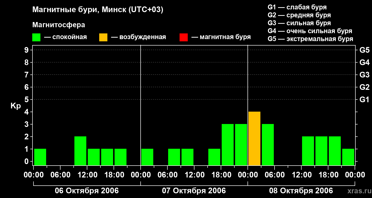 Изменения геомагнитного индекса Kp с 6 по 8 октября 2006 года для средних широт