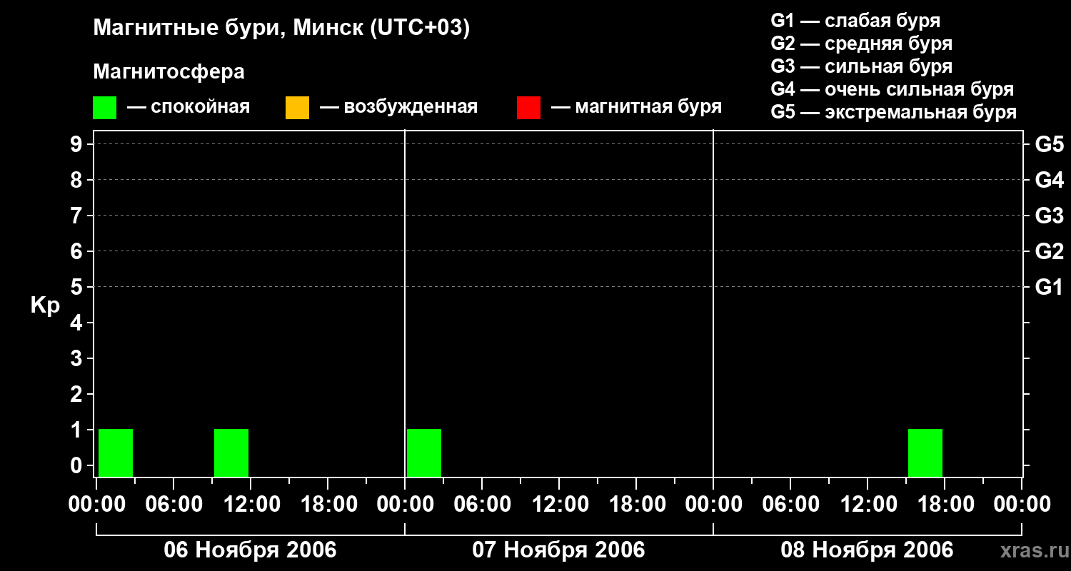 Изменения геомагнитного индекса Kp с 6 по 8 ноября 2006 года для средних широт