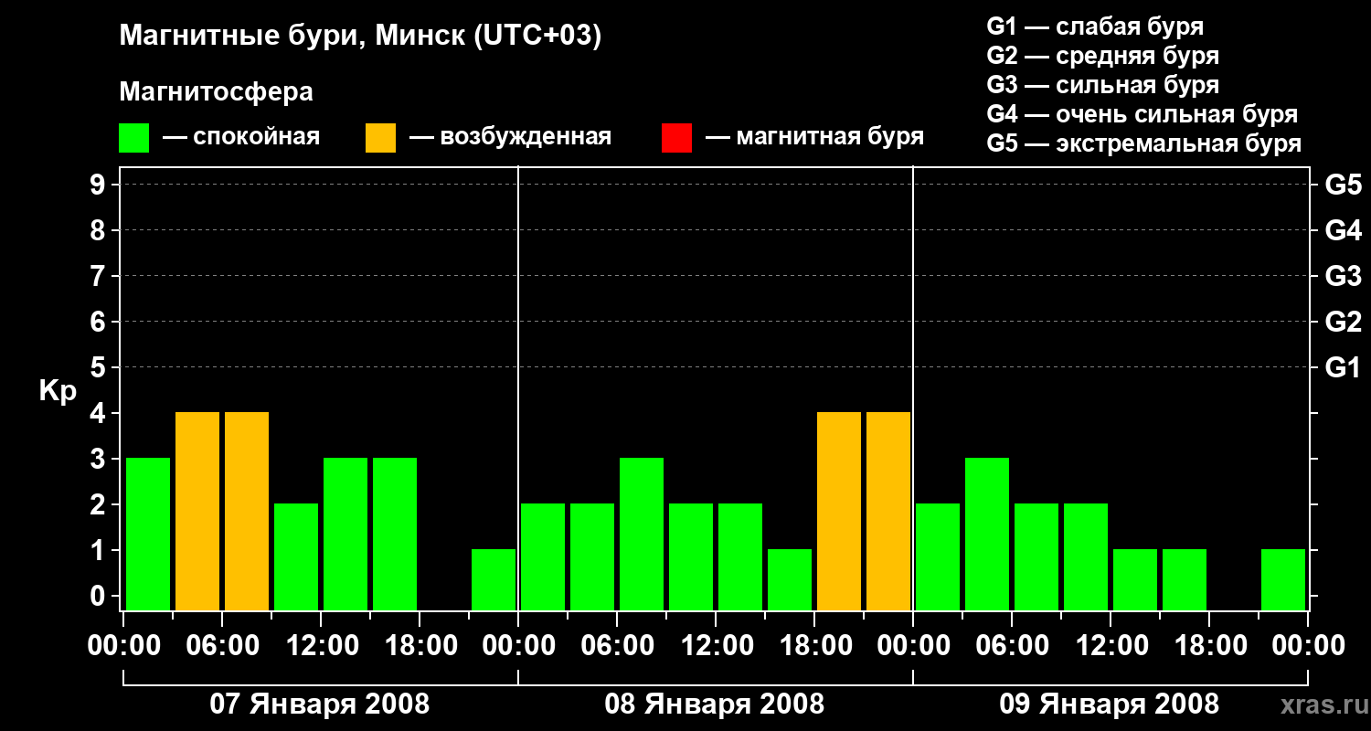 Изменения геомагнитного индекса Kp с 7 по 9 января 2008 года для средних широт