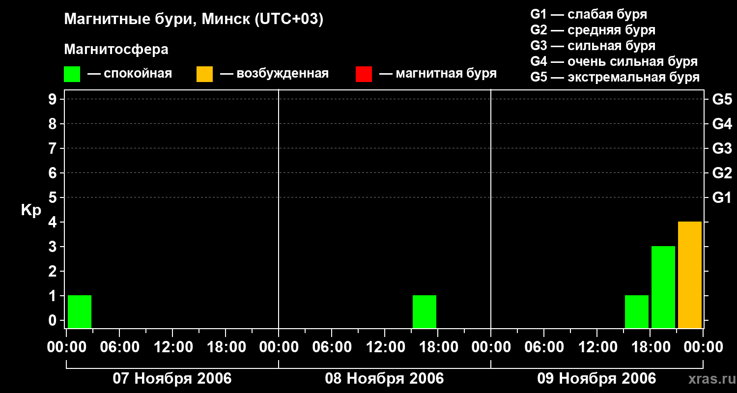 Изменения геомагнитного индекса Kp с 7 по 9 ноября 2006 года для средних широт