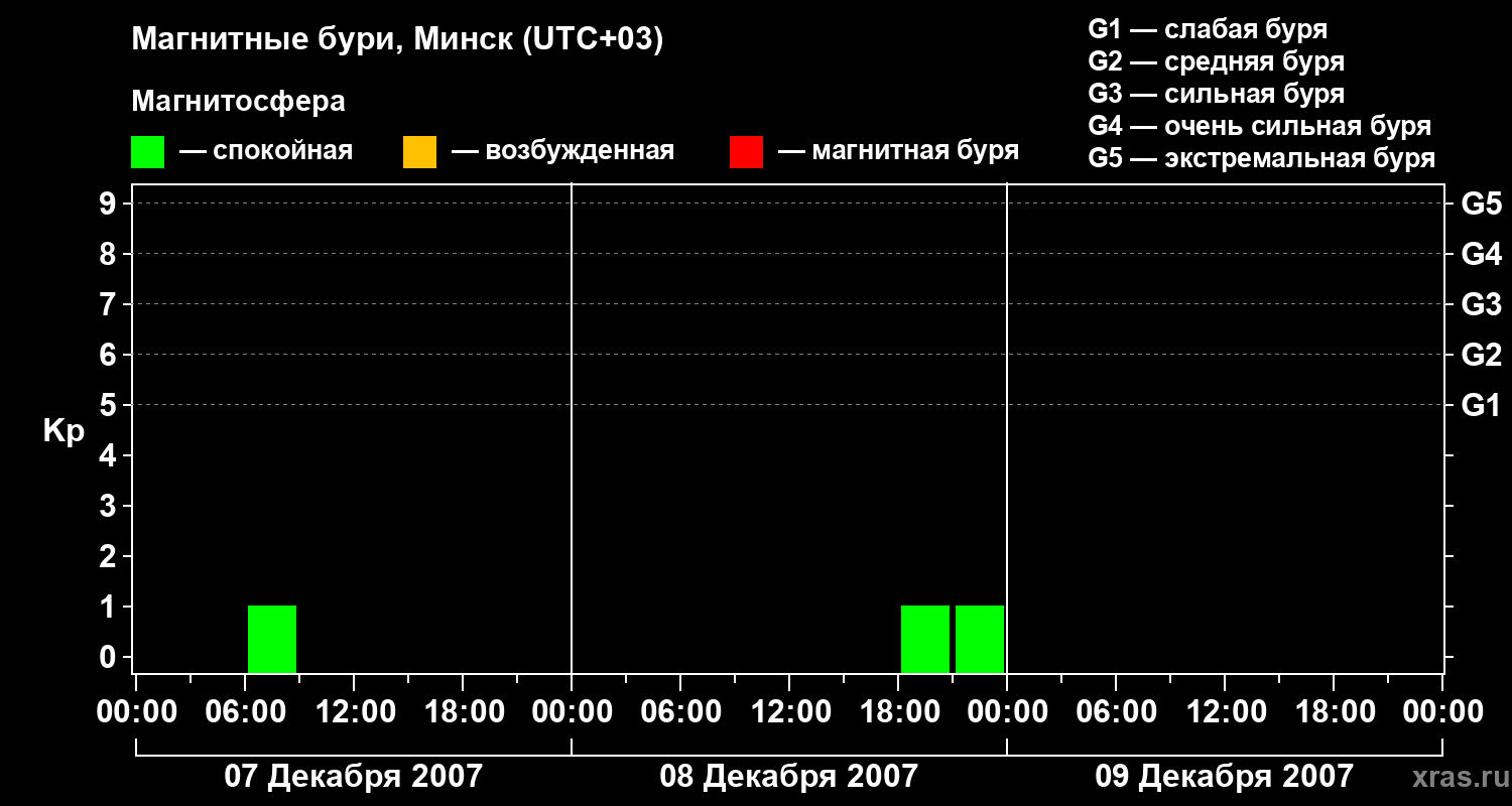 Изменения геомагнитного индекса Kp с 7 по 9 декабря 2007 года для средних широт