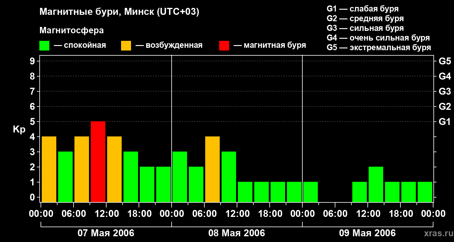 Изменения геомагнитного индекса Kp с 7 по 9 мая 2006 года для средних широт