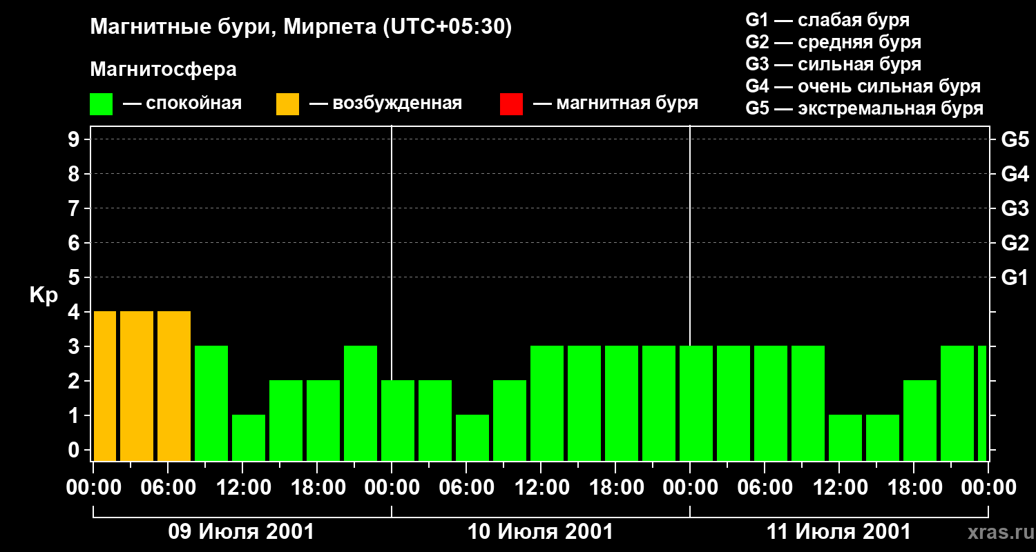 Изменения геомагнитного индекса Kp с 9 по 11 июля 2001 года для средних широт