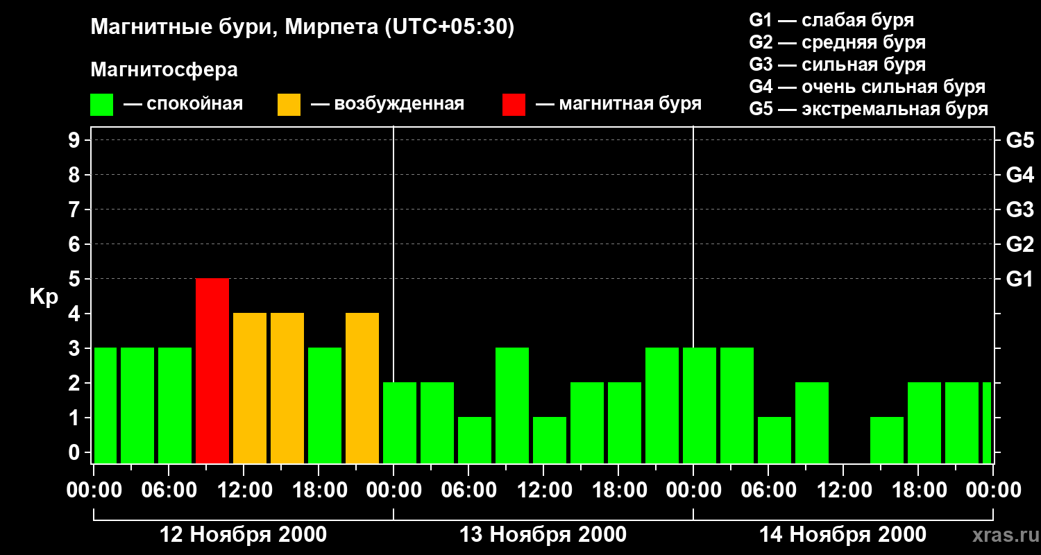 Изменения геомагнитного индекса Kp с 12 по 14 ноября 2000 года для средних широт
