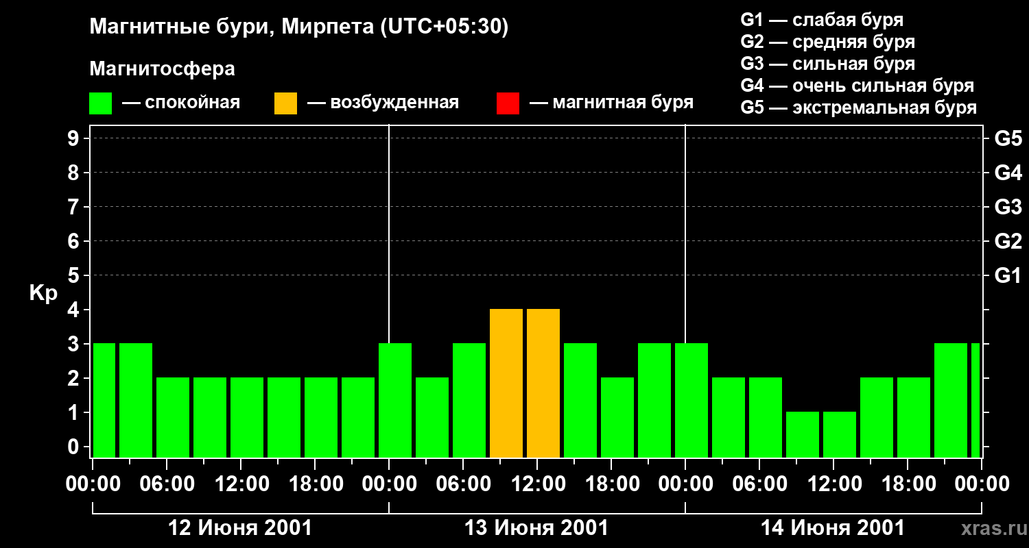Изменения геомагнитного индекса Kp с 12 по 14 июня 2001 года для средних широт