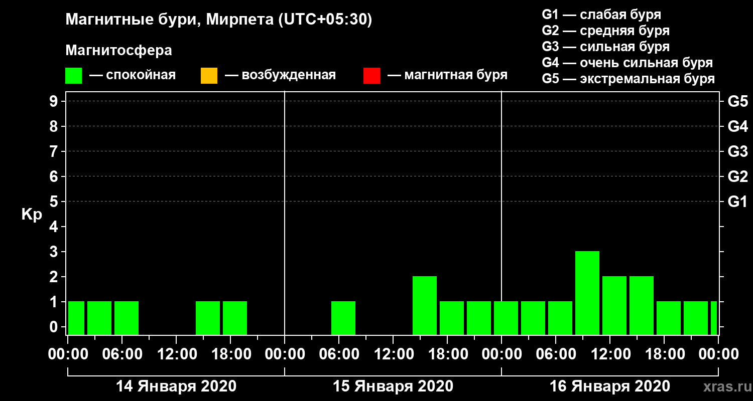 Изменения геомагнитного индекса Kp с 14 по 16 января 2020 года для средних широт