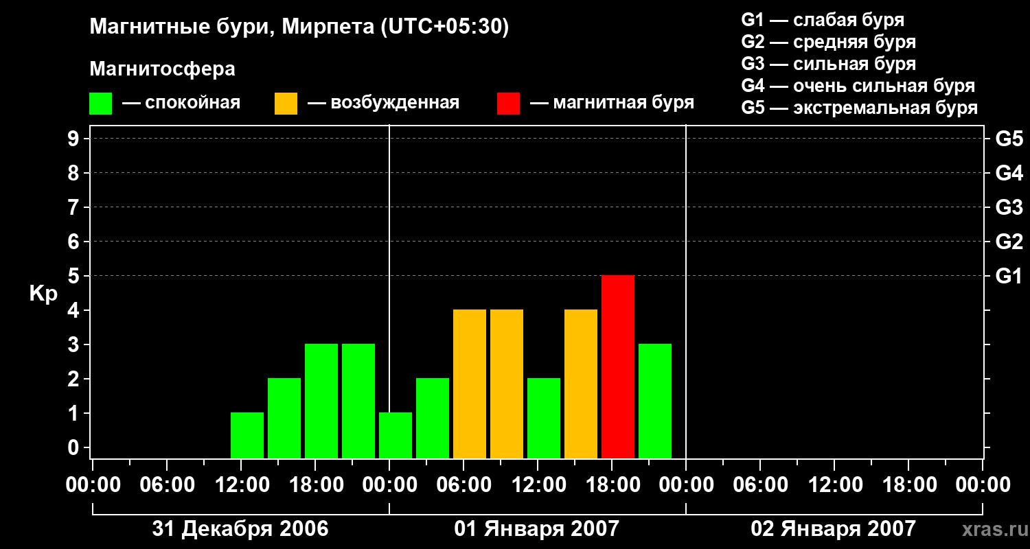Изменения геомагнитного индекса Kp с 31 декабря 2006 года по 2 января 2007 года для средних широт