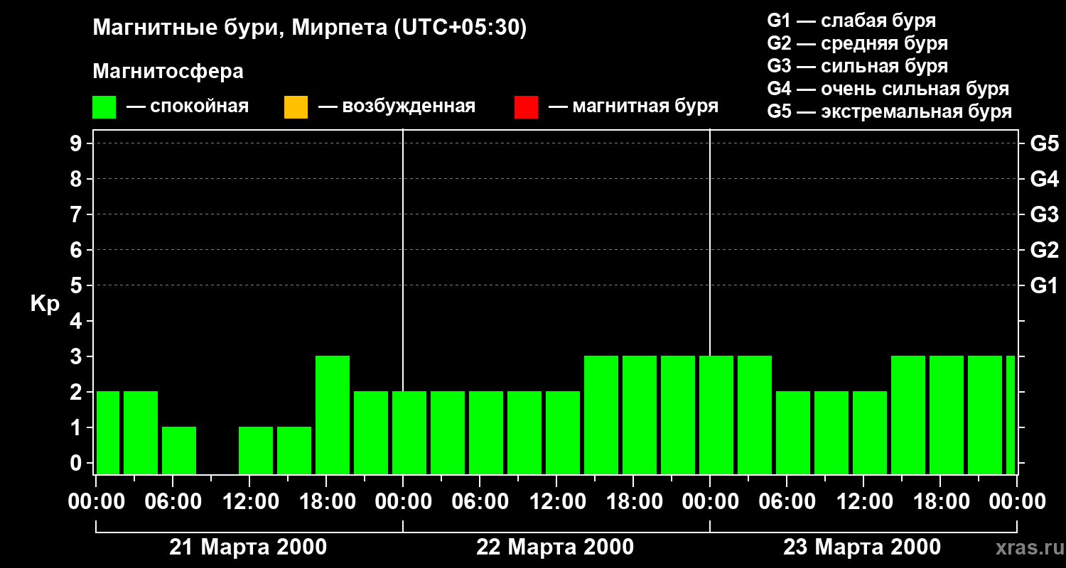 Изменения геомагнитного индекса Kp с 21 по 23 марта 2000 года для средних широт