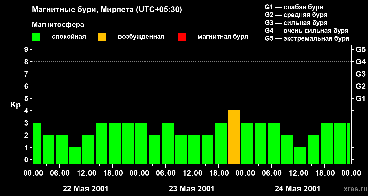 Изменения геомагнитного индекса Kp с 22 по 24 мая 2001 года для средних широт