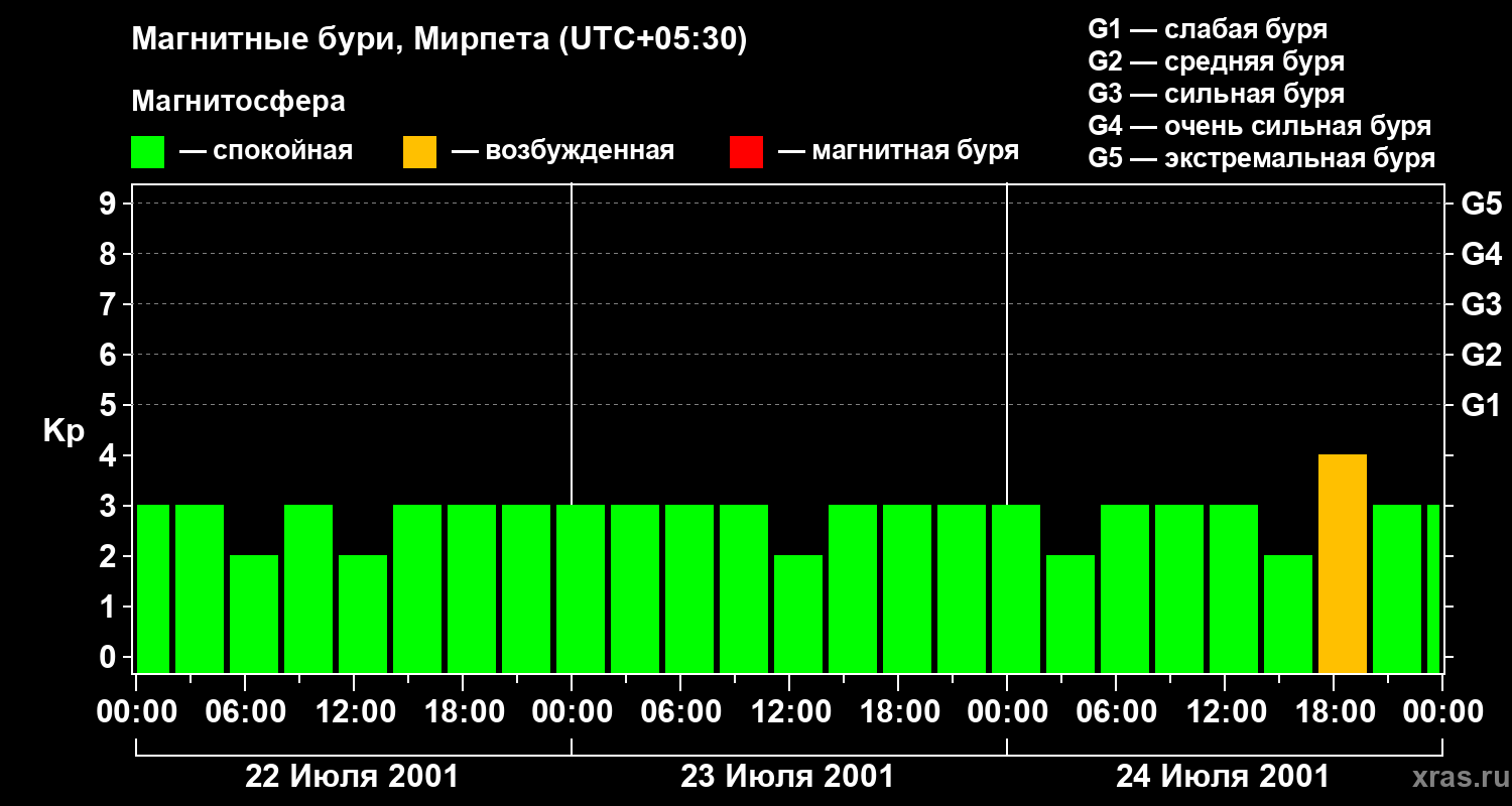 Изменения геомагнитного индекса Kp с 22 по 24 июля 2001 года для средних широт