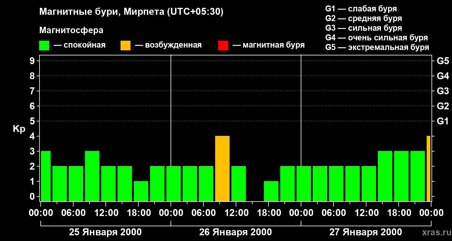 Изменения геомагнитного индекса Kp с 25 по 27 января 2000 года для средних широт