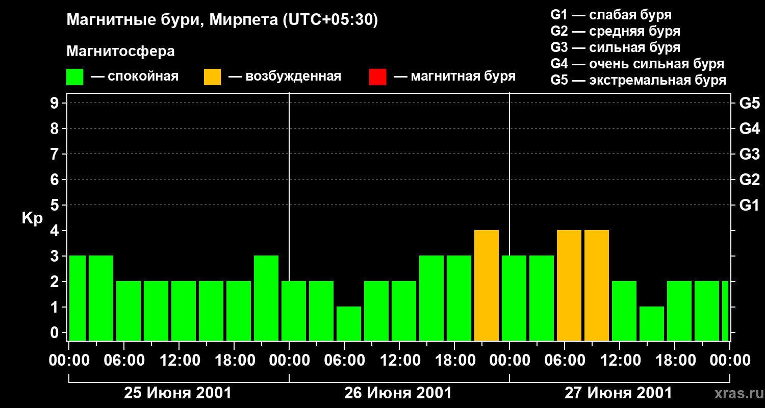 Изменения геомагнитного индекса Kp с 25 по 27 июня 2001 года для средних широт