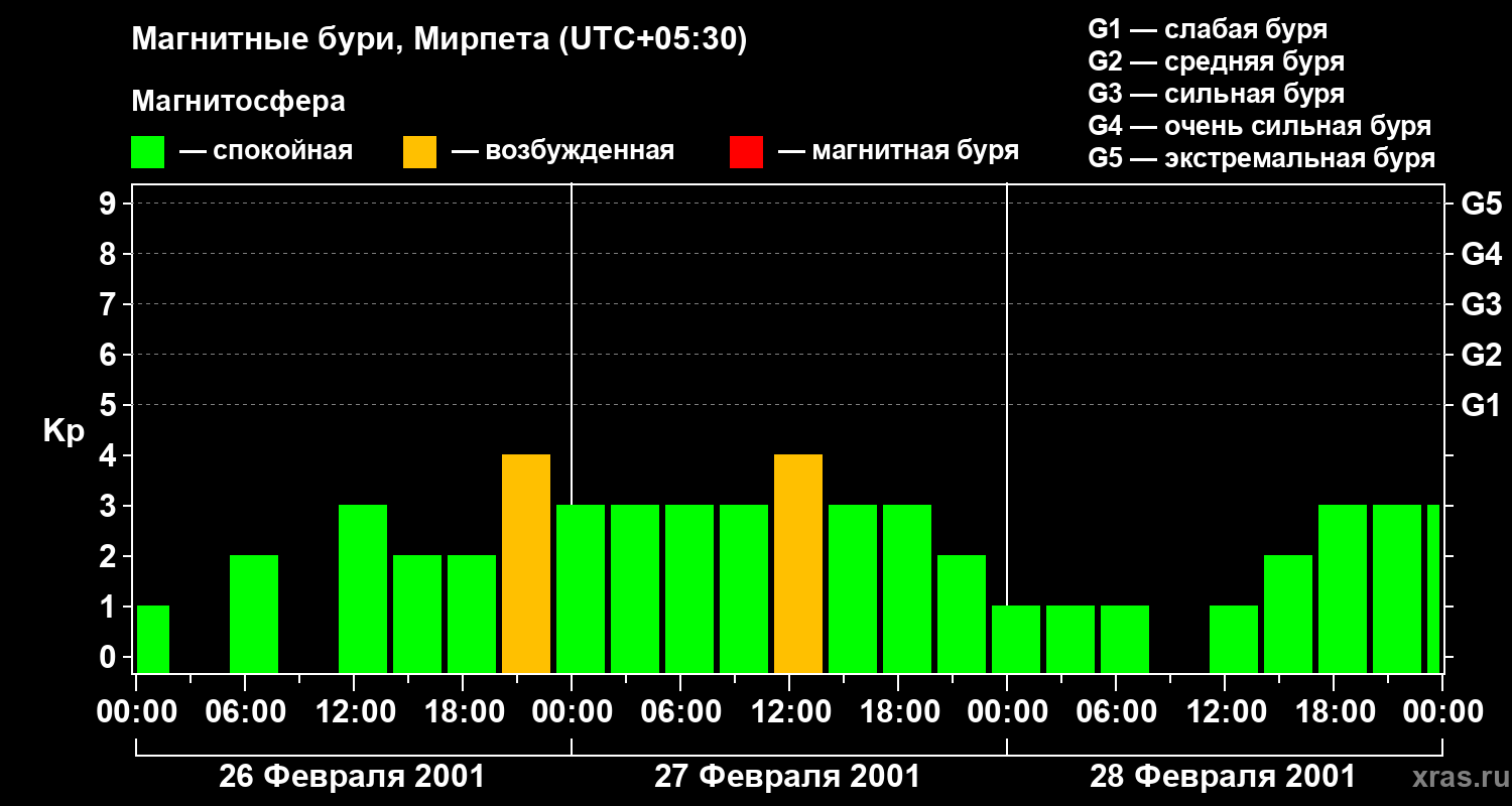 Изменения геомагнитного индекса Kp с 26 по 28 февраля 2001 года для средних широт