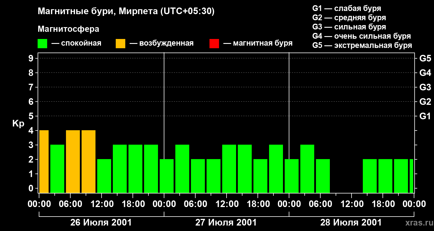 Изменения геомагнитного индекса Kp с 26 по 28 июля 2001 года для средних широт