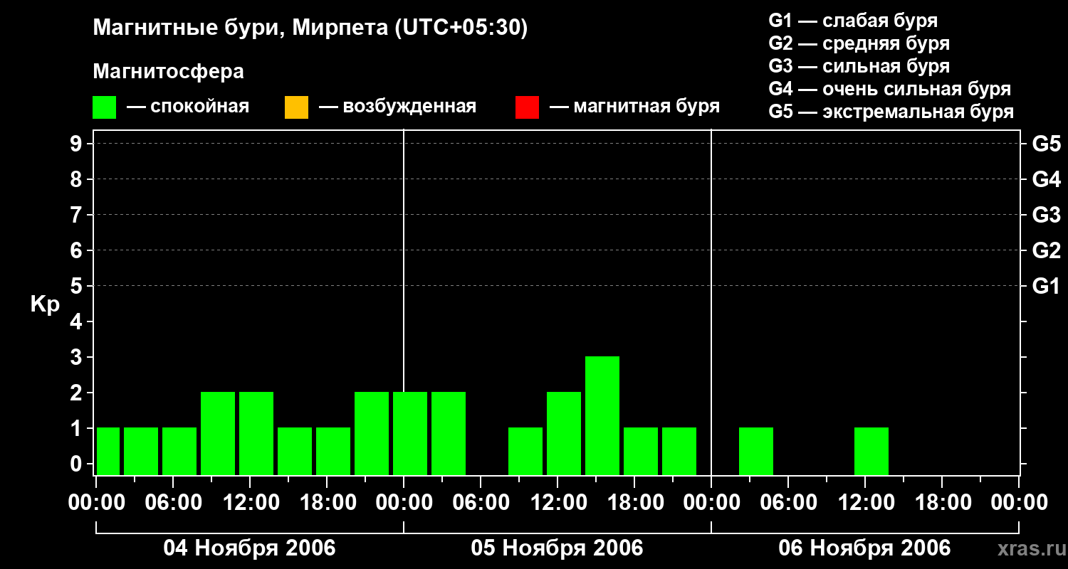 Изменения геомагнитного индекса Kp с 4 по 6 ноября 2006 года для средних широт