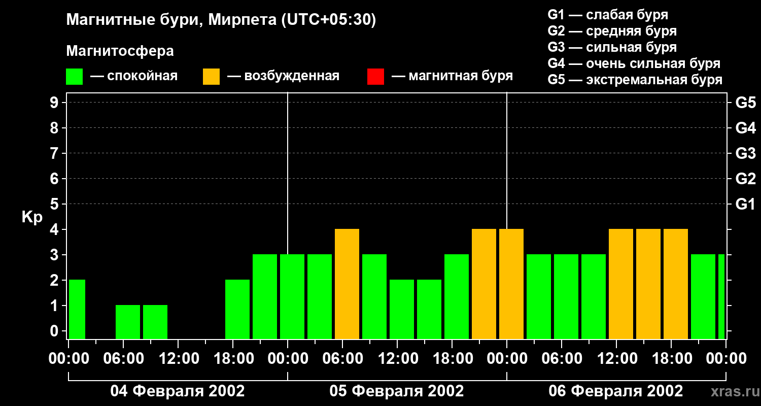 Изменения геомагнитного индекса Kp с 4 по 6 февраля 2002 года для средних широт
