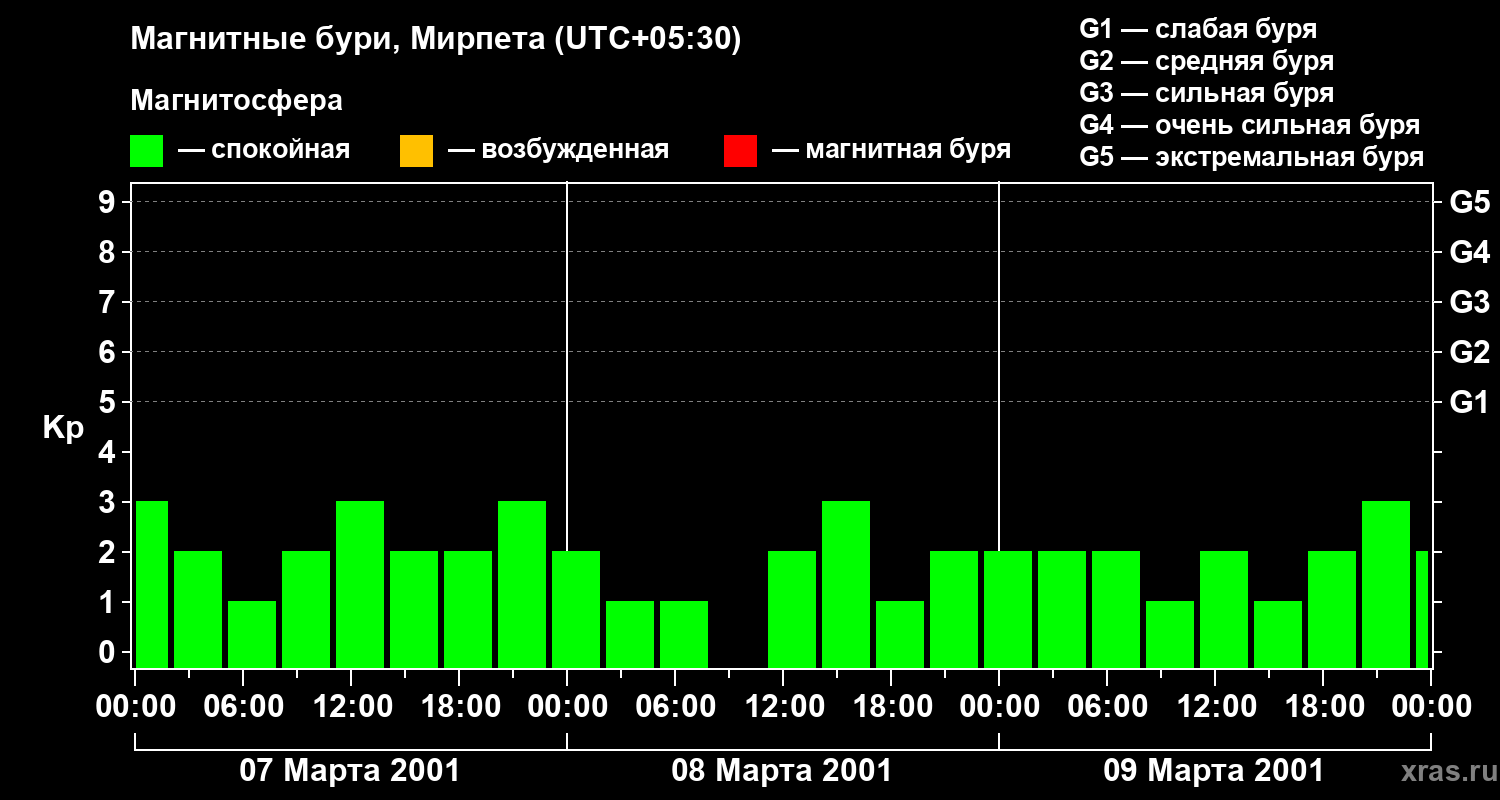 Изменения геомагнитного индекса Kp с 7 по 9 марта 2001 года для средних широт