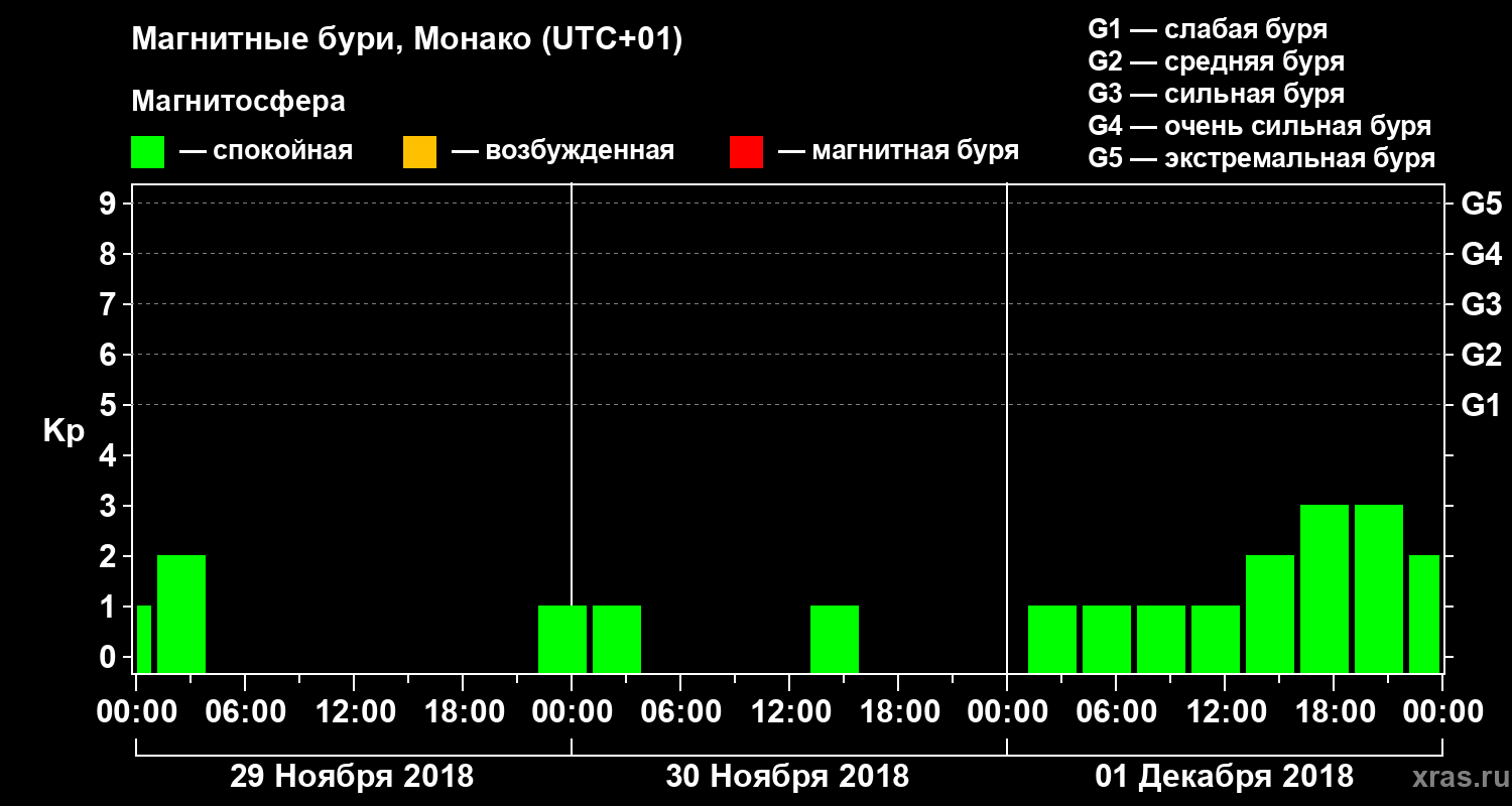Изменения геомагнитного индекса Kp с 29 ноября по 1 декабря 2018 года для средних широт