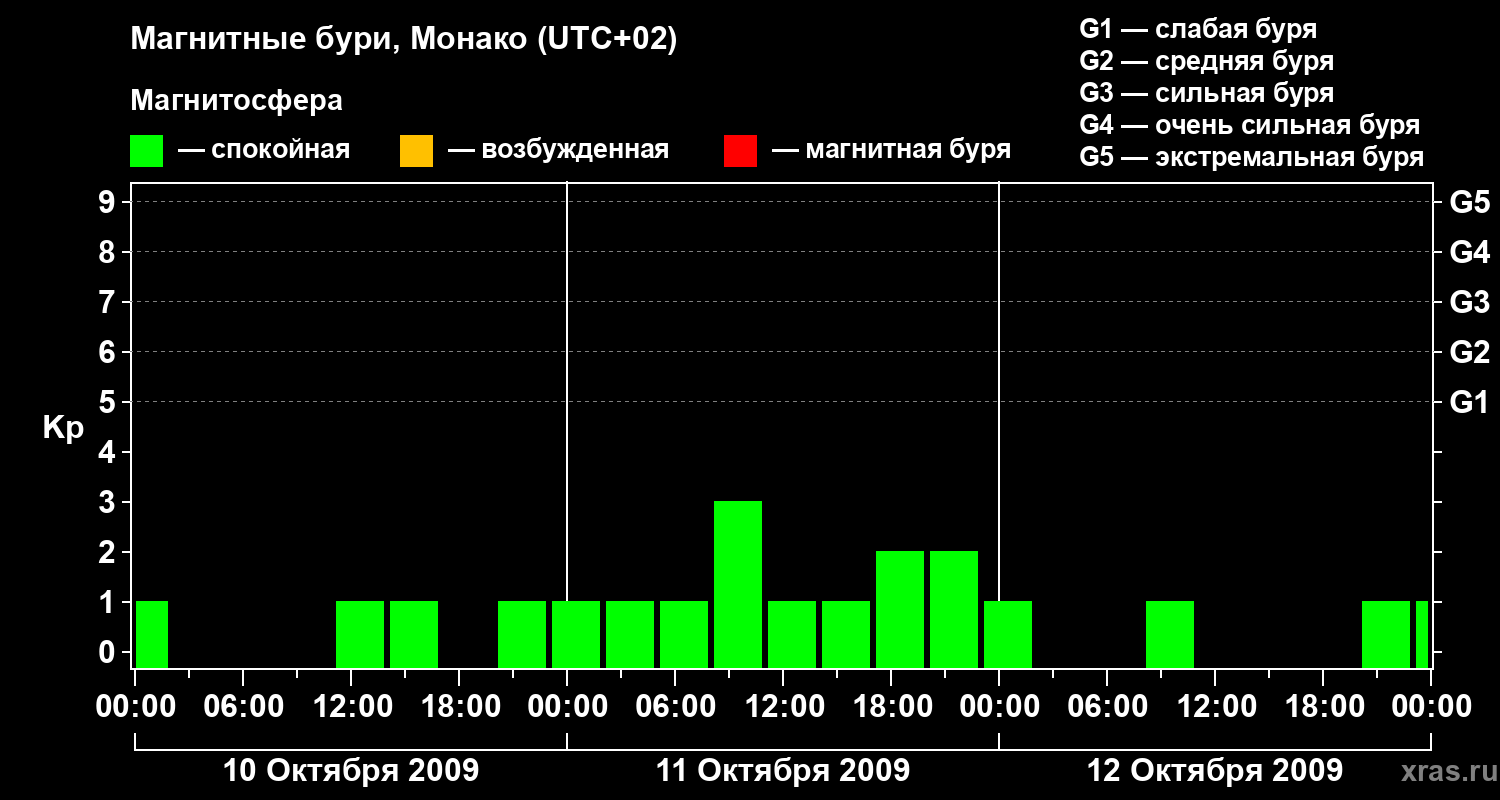 Изменения геомагнитного индекса Kp с 10 по 12 октября 2009 года для средних широт